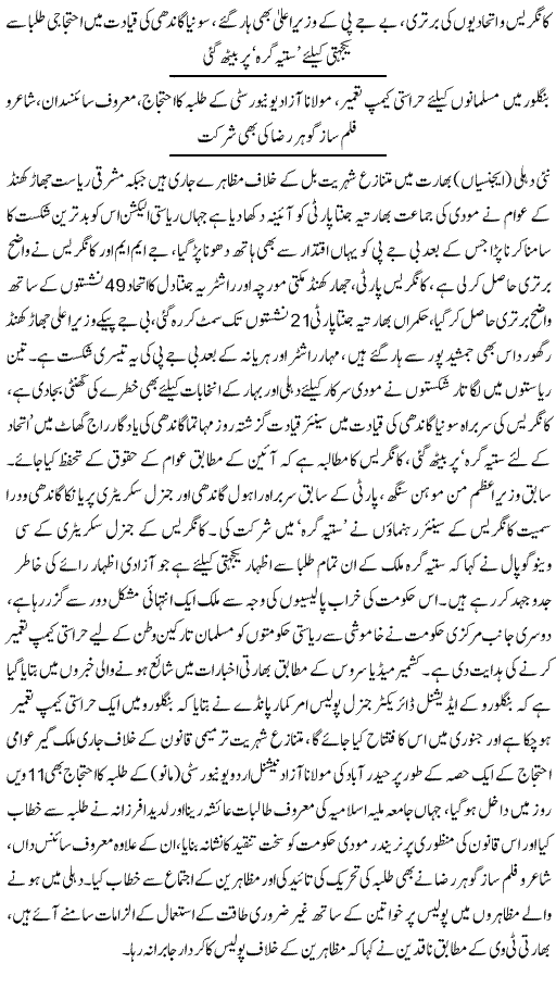 اترپردیش میں پولیس مسلمان اکثریتی محلوں میں دھاوا بول کر گھر گھر تلاشی لینے کے بہانے اندر گھس جاتی ہے اور لوگوں کو تشدد کا نشانہ بناتی ہے۔ مظاہرین کو منتشر کرنے کے لیے پولیس کی ان پر سیدھی گولیاں چلانے کی ویڈیوز بھی سامنے آئی ہیں۔ بھارتی وزارت اطلاعات و نشریات نے آزادی اظہار کو دبانے کے لیے نیوز چینلز کو بھی مظاہروں کی کوریج نہ کرنے کا کہا ہے۔