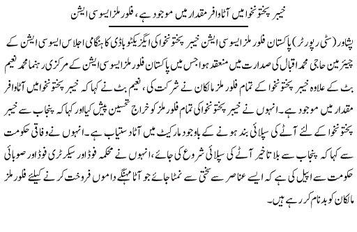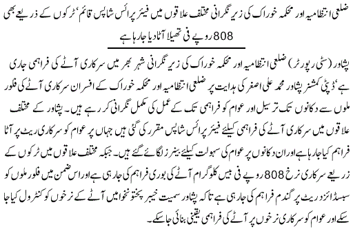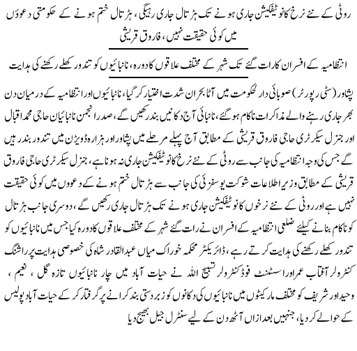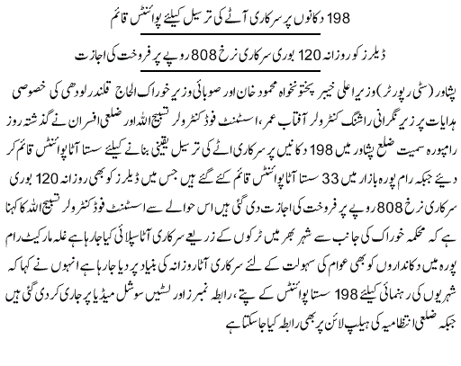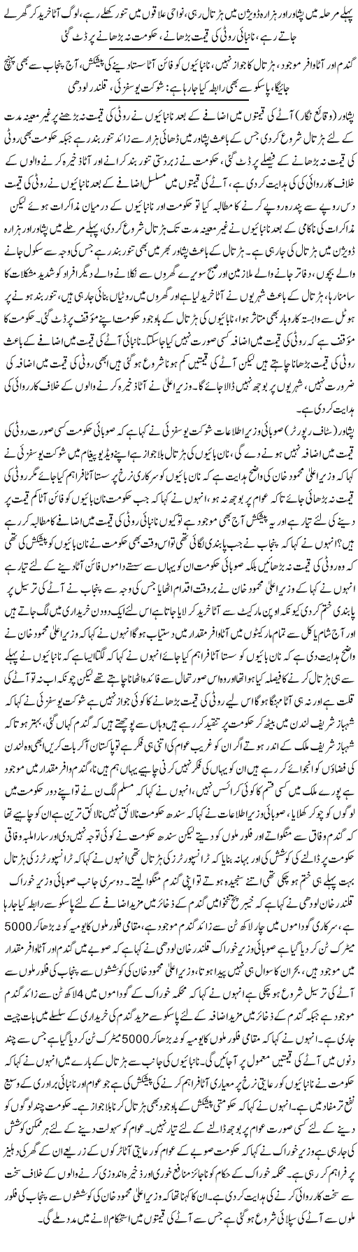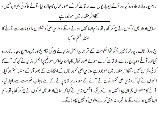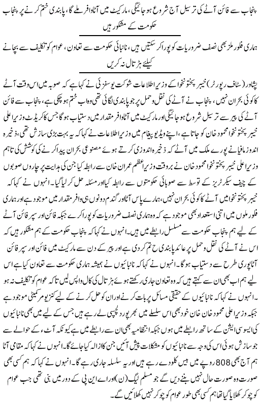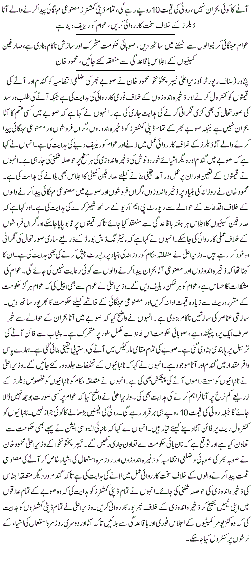 دوسری طرف وزیراعلیٰ محمود خان نے نانبائیوں کو مخصوص ڈیلروں کے ذریعے کم نرخ پر آٹا فراہم کرنے کی ہدایت کر دی۔ضلعی انتظامی اور کنزیومر کمیٹی کا اجلاس پشاور میں جاری ہے جس میں نانبائی ایسوسی ایشن کے عہدیدار بھی موجود ہیں۔نانبائی ایسوسی ایشن نے روٹی 15 روپے کرنے کا مطالبہ کیا جسے حکومت نے مسترد کردیا۔ وزیراعلیٰ محمود خان نے کہا کہ وہ کسی صورت عوام پر بوجھ نہیں ڈالنے دیں گے، پنجاب نے فائن آٹے کی ترسیل پر پابندی ہٹا دی ہے اسلئے روٹی کی قیمتیں بڑھانے کا کوئی جواز نہیں بنتا، حکومت نان بائیوں کو کنٹرول ریٹ پر فائن آٹا دینے کے لیے تیار ہے۔ وزیر اعلیٰ نے کہا کہ جب فائن آٹے سمیت تمام طرح کا آٹا مارکیٹ میں دستیاب ہے تو پھر قیمت کیوں بڑھائی جائے؟۔انہوں نے کہا کہ نانبائی ایسوسی ایشن سے پہلے بھی حکومت نے تعاون کیا ہے اور آئندہ بھی یہ تعاون جاری رہے گا تاہم توقع ہے کہ نان بائی بھی حکومت سے تعاون جاری رکھیں گے۔