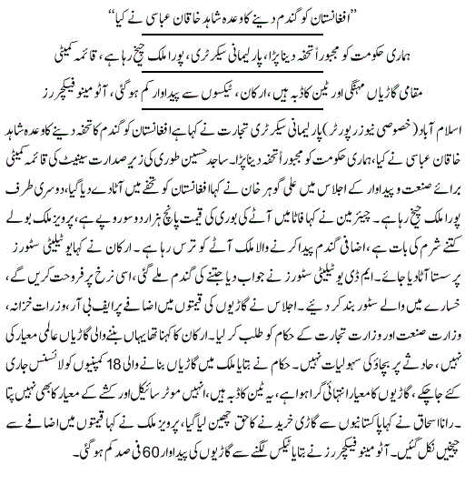 ان کا کہنا تھا کہ ”یہ کمپنیاں سالانہ اربوں روپے منافع کما رہی ہیں، اس کے باوجود کاروں کی قیمتیں اوپر جا رہی ہیں۔ پاکستان میں بننے والی کاروں کا معیار کم از کم درآمد کی جانے والی کاروں کے برابر ہونا چاہیے۔“وزارت کے ایڈیشنل سیکرٹری کیپٹن ریٹائرڈ شیر عالم محسود نے اجلاس میں وزارت اور ذیلی اداروں کے حکام پر عائد کیا گیا الزام مسترد کر دیا۔ انہوں نے کہا کہ ”حکام کے اربوں روپے کی رشوت لینے کا کوئی ثبوت موجود نہیں ہے۔ میں نے بریف کیسز کے بارے میں سنا تو ہے لیکن اپنی آنکھوں سے بریف کیس کبھی دیکھے نہیں ہیں۔ میرے خیال میں وزارت یا ذیلی اداروں کا کوئی شخص کرپشن میں ملوث نہیں ہے۔“