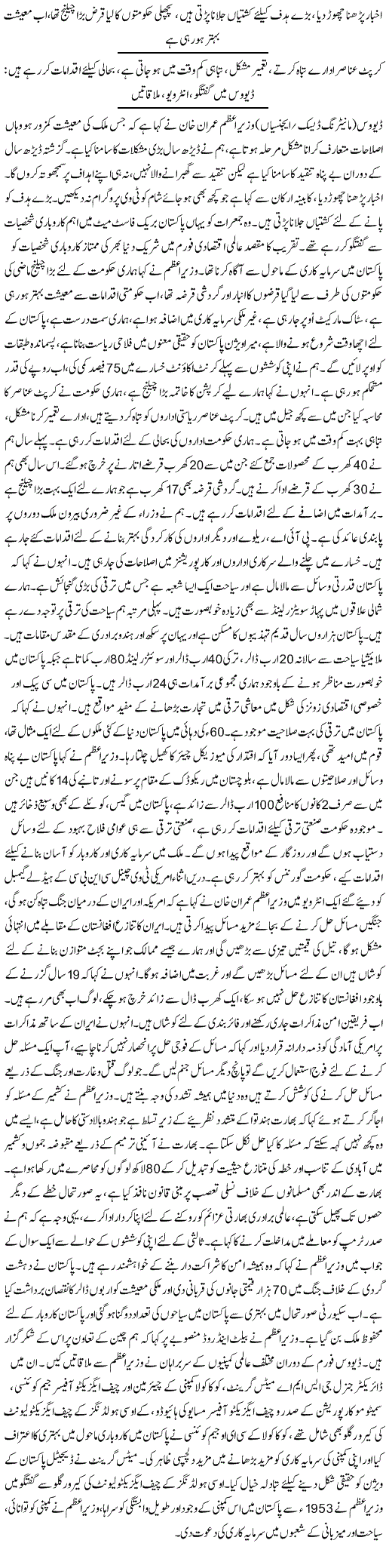 ورلڈ اکنامک فورم کے موقع پر وزیر اعظم عمران خان نے تقریباً 29 منٹ طویل فی البدیہہ خطاب کیا۔ جب وہ اپنا خطاب مکمل کرکے سوال و جواب کے سیشن کیلئے آئے تو میزبان نے ان کا شکریہ ادا کیا اور فی البدیہہ تقریر کو متاثر کن کہا۔ وزیر اعظم جب تقریر کرنے کے بعد بیٹھنے لگے تو میزبان نے کہا کہ ’ مسٹر پرائم منسٹر ، ملک کیلئے اپنے عزائم سے آگاہ کرنے کا شکریہ، آپ نے بغیر کسی پرچی کی مدد سے انتہائی فصیح و بلیغ انداز میں اپنا وژن پیش کیا جو انتہائی متاثر کن ہے۔‘