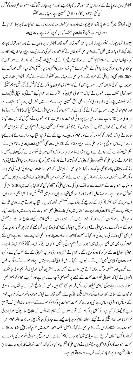 تفصیلات کے مطابق وزیر اعلیٰ خیبر پختون خوا محمود خان نے صوبے کے تمام ڈپٹی کمشنروں کو ہدایت کی کہ وہ کنزیومر کمیٹیوں کے اجلاس فوری اور باقاعدگی سے بلائیں تاکہ آٹے اور دوسری روز مرہ کے استعمال کی اشیاء کے نرخوں پر کنٹرول کیا جا سکے،تمام ماریکٹس سے متعلق مجموعی رپورٹس اور قیمتوں میں استحکام سے متعلق معلومات پی ایم آر یو کو بھیجیں تاکہ وہ اس بارے میں رپورٹس وزیر اعلیٰ کو بھیج سکیں۔واضح رہے کہ ان تمام معاملات کو وزیر اعلیٰ خیبر پختونخوا محمود خان خود مانیٹر کریں گے۔