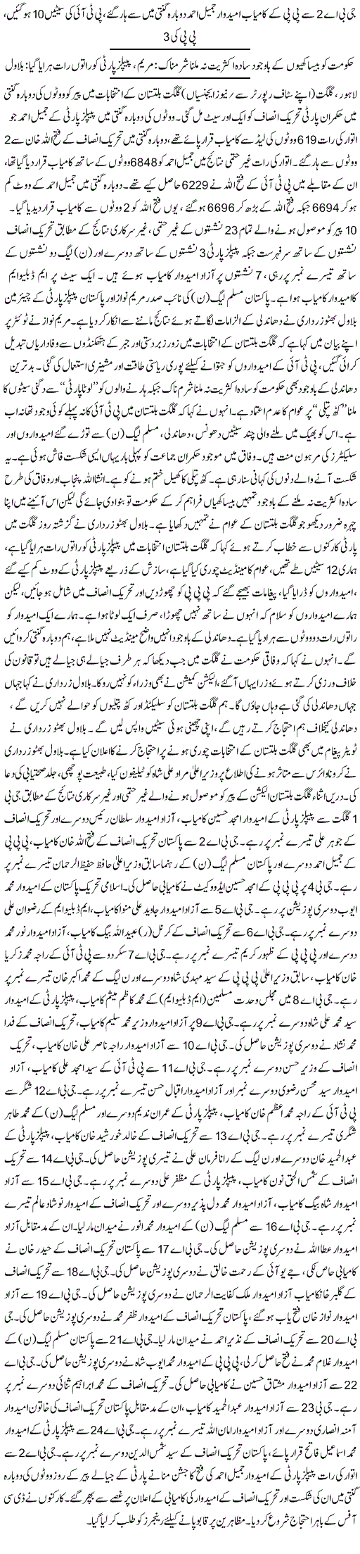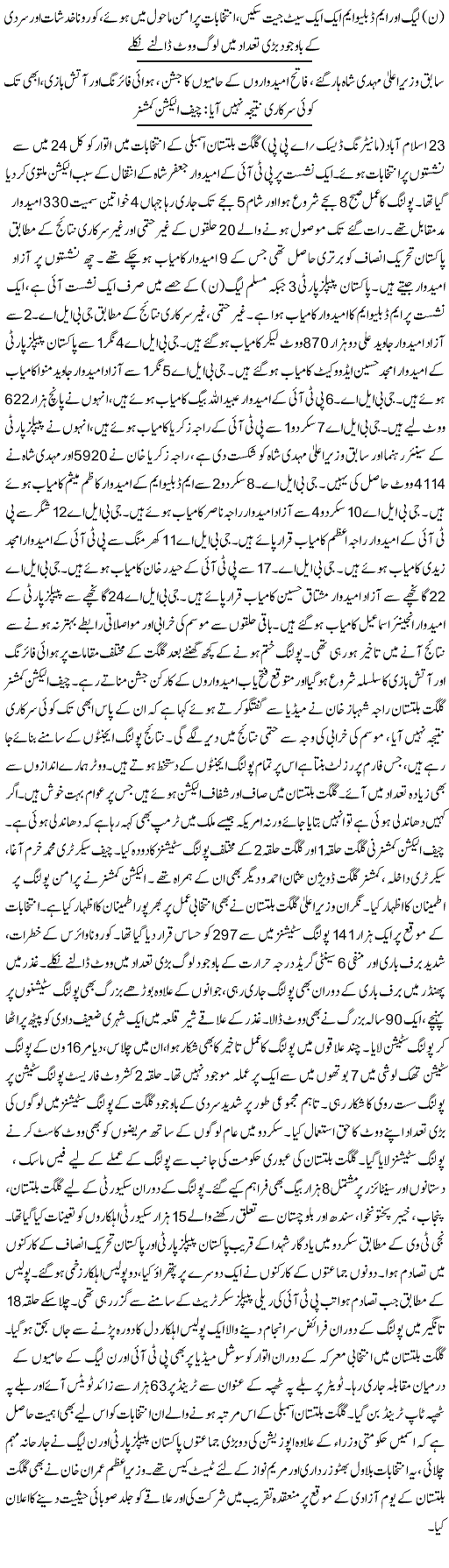خیال رہے کہ 15نومبر کو ہونے والے گلگت بلتستان کے انتخابات میں پی ٹی آئی 9 نشستوں پر کامیاب ہوئی تھی ،پیپلزپارٹی تین اور مسلم لیگ ن ایک سیٹ حاصل کرنے میں کامیاب رہی جبکہ 8 آزاد امیدوار کامیاب ہوئے۔تاہم اپوزیشن کی جانب سے جی بی الیکشن میں دھاندلی کے الزامات لگائے گئے ہیں جسے پی ٹی آئی اور الیکشن کمیشن گلگت بھی مسترد کر چکا ہے ۔ اب فافن رپورٹ میں بھی گلگت بلتستان کے الیکشن میں شفافیت سامنے آگئ۔