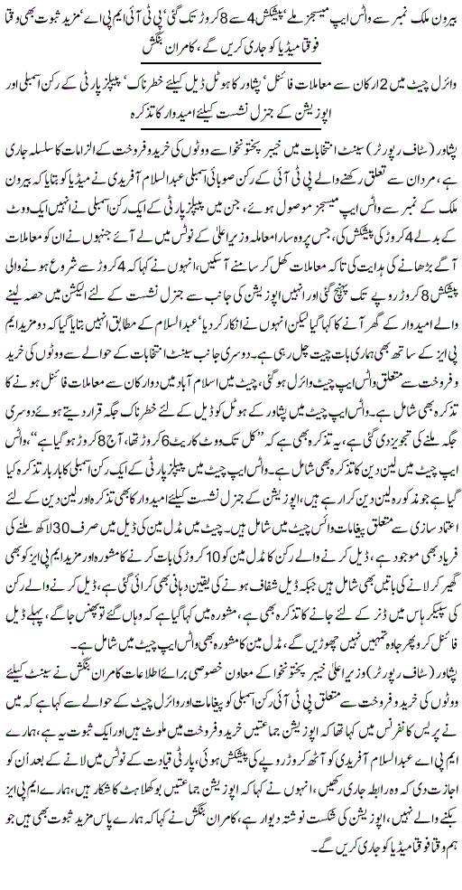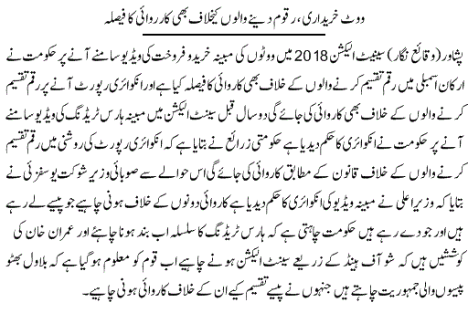 تفصیلات کے مطابق صحافی اسد علی طور نے اپنے یوٹیوب چینل پر سات منٹ پر مبنی ایک ویڈیو شیئر کی ہے جس میں ان کا کہناتھا کہ ”پی ڈی ایم کے ذرائع نے بتایاہے کہ یہ دیکھا جا رہا تھا کہ جنہوں نے یوسف رضا گیلانی کے نام پر سٹمپ لگائی شائد وہی یہ وہ سات لوگ ہیں جنہوں نے مرزا محمد آفریدی کو ووٹ دیاہے ، جو کہ ڈپٹی چیئرمین سینیٹ ہیں ،لیکن اب یہ کہاجارہاہے کہ ایسا نہیں ہے ، پی ڈی ایم کے ذرائع کی طرف سے الزام عائد کیا جارہاہے کہ مرزا محمد آفریدی نے ڈپٹی چیئرمین سینیٹ کے انتخاب میں ووٹ کے بدلے میں فی سینیٹر کو چھ کروڑ روپے اور ایک ایم جی گاڑی دینے کی پیشکش کی تھی ۔“