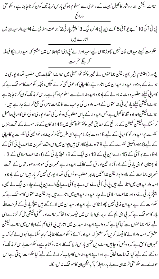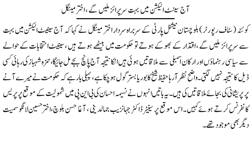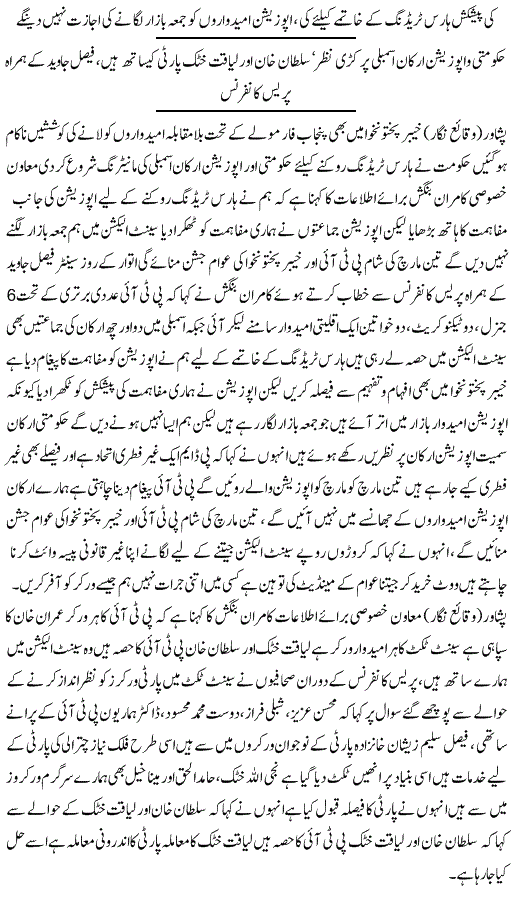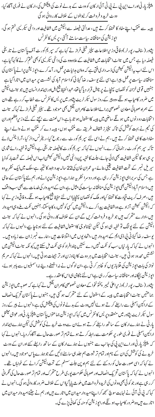 انہوں نے اس دوران الیکشن کمیشن اور سپریم کورٹ کا فیصلہ پڑھ کر سنایا کہ فیصلہ ووٹر کی نیت پر ہوگا۔سات ووٹ قانون کے مطابق کاسٹ ہوئے۔ چیئرمین سینیٹ کا الیکشن عوام کے سامنے چوری کیا گیا۔ہمیں امید ہے کہ ہمیں ہائی کورٹ سے انصاف ملے گا اور فیصلہ ہمارے حق میں آئے گا۔میں نے جنرل الیکشن میں بھی اپنے نام کے اوپر مہر لگائی تھی۔پریذائیڈنگ آفیسر نے ایک جانبدار انہ فیصلہ کیا۔رولز کے مطابق یہ ساتوں ووٹ ٹھیک طریقے سے ڈالے گئے۔عدم اعتماد کے حوالے سے ابھی ہماری مشاورت چل رہی ہے۔ مگر میرا خیال ہے کہ ہمیں عدالت میں جانا چاہیے۔ ہم چاہتے ہیں ہر ادارہ نیوٹرل رہے۔پاکستان میں اس وقت ہر ادارہ نیوٹرل نہیں ہے۔یہ ہماری کوششوں کا نتیجہ ہے کہ کچھ تو رزلٹ سامنے آیا ہے، ملک کے کونے کونے سے حکومت کو شکست کا سامنا کرنا پڑا۔ الیکشن کمیشن نیوٹرل طریقے سے اپنے آپ کو چلا رہا ہے۔