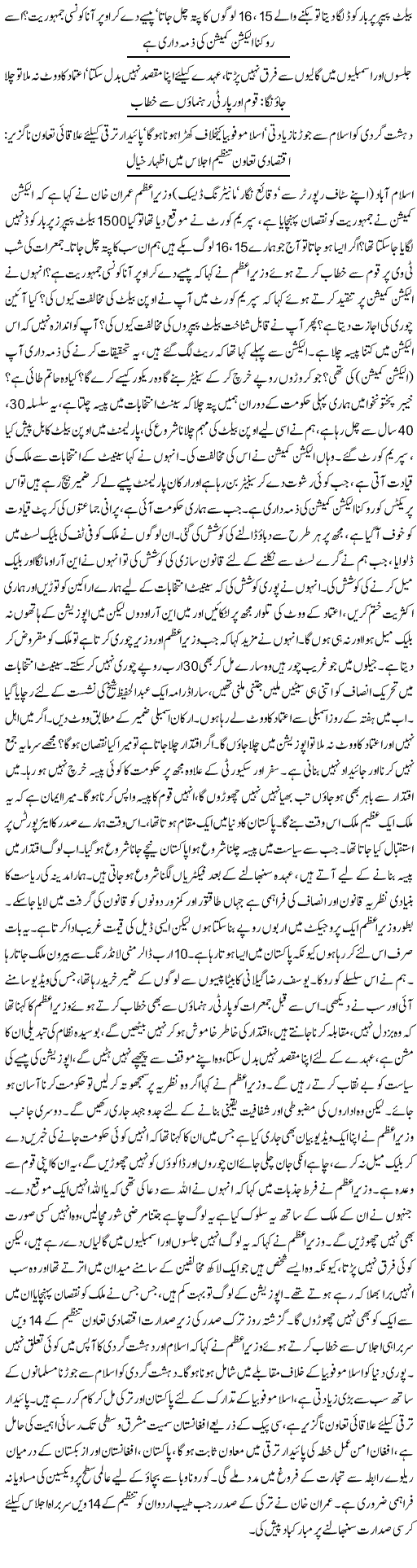انہوں نے کہا کہ سینیٹ کے الیکشن میں صرف 100 لوگ ووٹ کاسٹ کرتے ہیں۔ وزیراعظم نے تو پہلے ہی کہا تھا کہ اوپن بیلٹ کی حمایت کریں لیکن مسلم لیگ ن نے وقتی فائدے کیلئے قانون تبدیل کرنے سے انکار کیا، سیاستدان یاد رکھیں کہ انہیں منتخب کرکے اسمبلیوں میں بھیجا گیا ہے۔