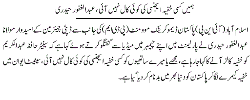 انہوں نے کہا کہ جہاں پر پولنگ بوتھ لگا ہوا تھا وہاں پر ہم گئے اور جب پولنگ بوتھ دیکھا تو وہاں پر سب سے پہلی چیز جو ہمیں نظر آئی وہ ایک لیمپ تھا ،ہم نے استفسار کیا کہ یہ لیمپ یہاں پر کس لئے رکھا گیا ہے ؟جس پر وہاں موجود سٹاف نے کہا کہ روشنی کے لئے رکھا گیا ہے ،ہم نے کہا کہ ہاؤس میں تو اتنی بڑی بڑی لائٹس لگی ہوئی ہیں یہاں پر تو روشنی کی ضرورت نہیں ہے،اس سے ہمیں تھوڑا شک گزرا کہ یہ معاملہ گڑ بڑہے ،اسی اثناء میں ، میں نے پیچھے مڑ کر دیکھا تو ٹی وی سکرین کے نیچے مجھے ایک کیمرہ نما چیز نظر آئی جو ٹیپ سے وہاں پر چپکائی گئی تھی ،میں نے ہاتھ بلند کرکے دیکھا تو وہ ٹیپ سمیت اتر گیا جس میں تار اور ایک چھوٹا سا کیمرہ لگا ہوا تھا ،اتنی دیر میں ڈاکٹر مصدق ملک نے اس کے ساتھ لگا ہوا ایک اور کیمرہ ڈھونڈ لیا ،ابھی ہم یہی گفتگو کر رہے تھےاور اپنی آواز اٹھانا شروع کی تو اور سینیٹرز بھی وہاں پر آنا شروع ہو گئے